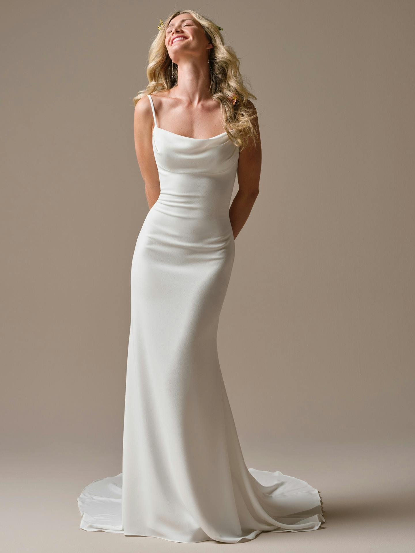 a sophisticated crepe sheath draped cowl neckline wedding dress