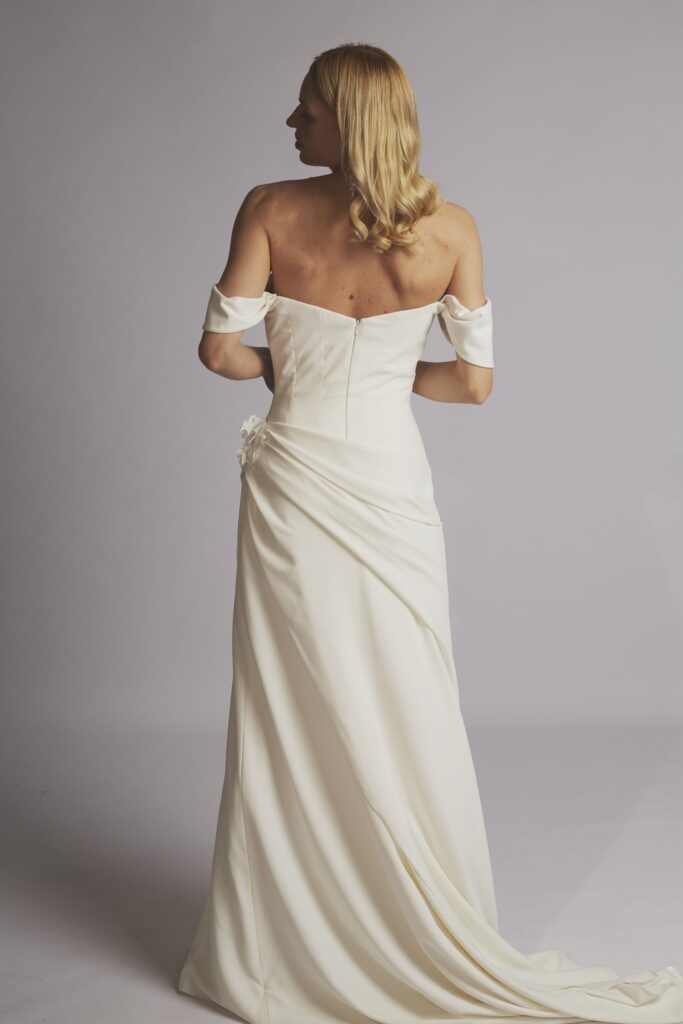 Geena by Jane Aston Bridal – Off the shoulder drop waist fully boned bodice with a flattering draped skirt and split