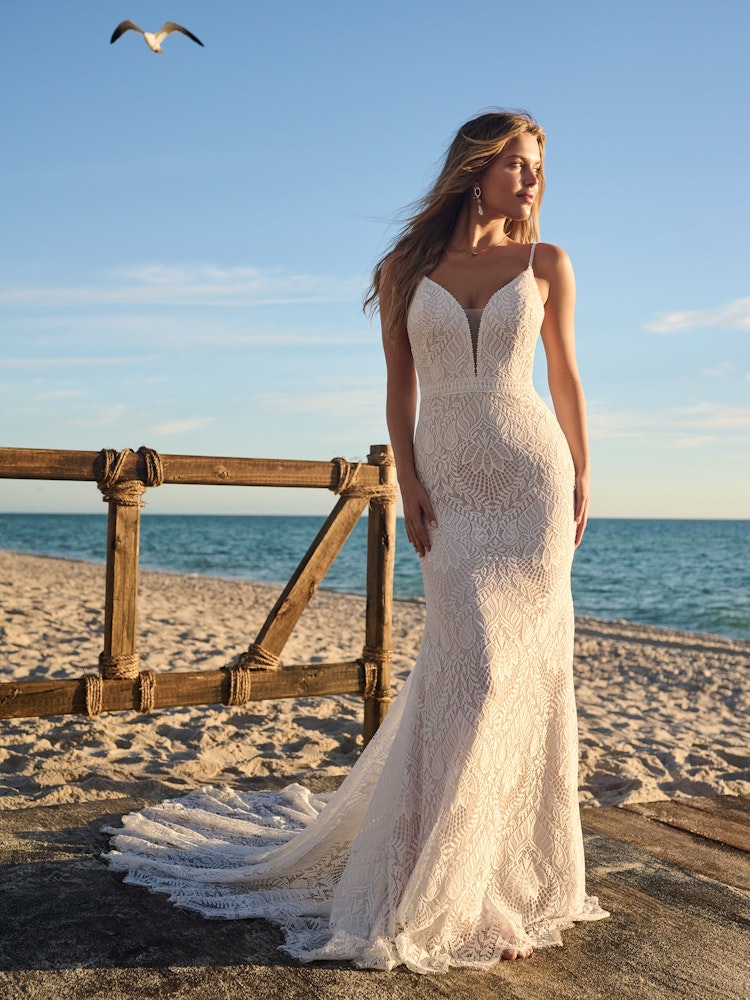 Janine by Rebecca Ingram – Beach bohemian knit lace Wedding dress with an open V back and plunging neckline.