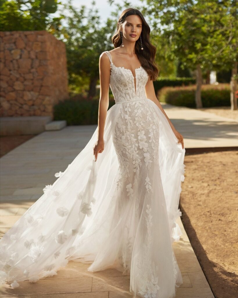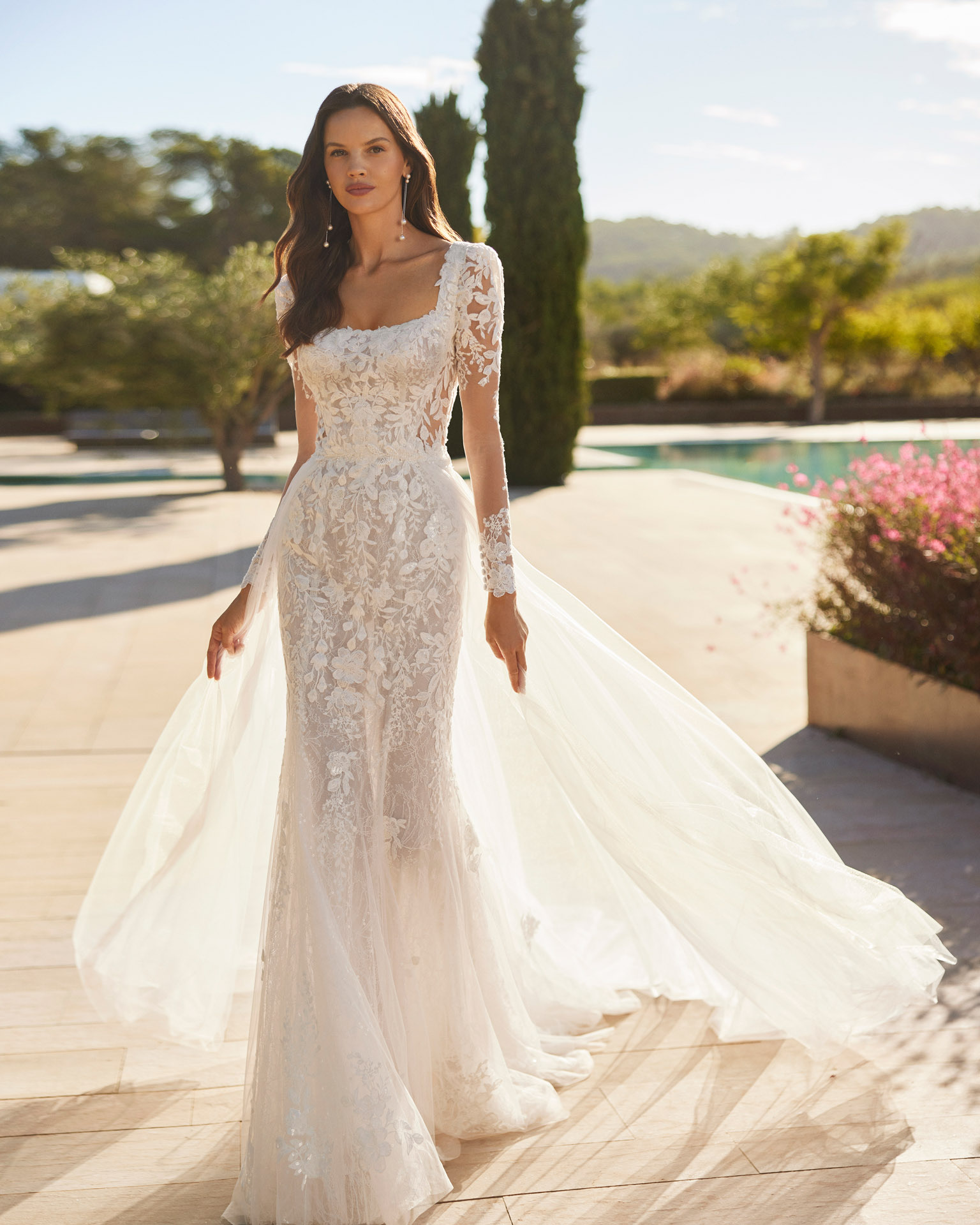 Sedal by Adriana Alier – Long two-piece mermaid wedding dress in lace with beading, square neckline, removable sleeves, open back, and overskirt.
