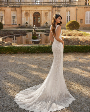 Vina by Rosa Clarà Dreams – Mermaid Wedding Dress made with beading, deep neckline, straps and V back. UK 12 Natural/nude WAS £2010 NOW £1450